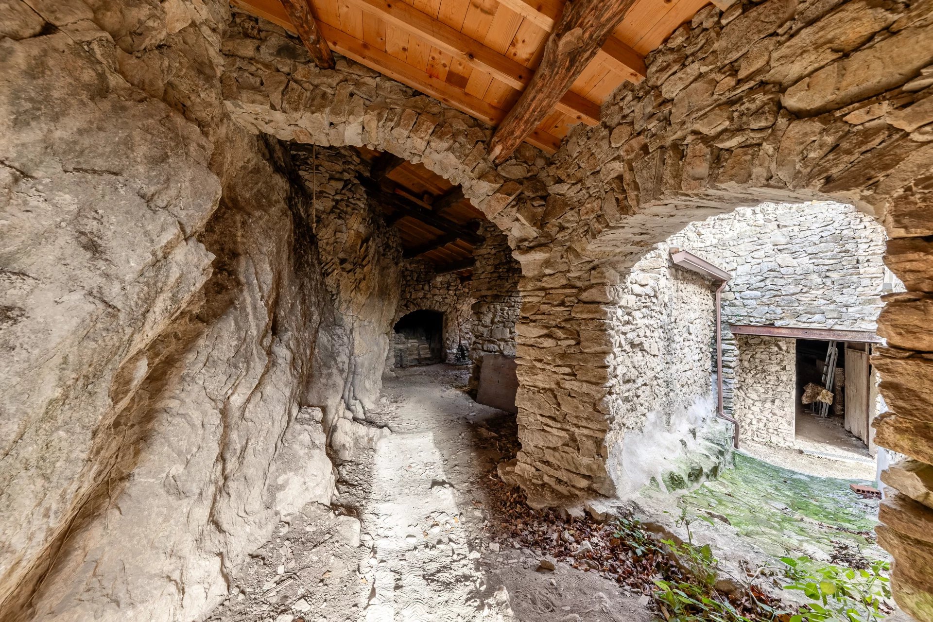 Plus bas, une ancienne pièce voûtée, héritière des usages agricoles d’autrefois, ouvre la voie à des possibilités multiples : atelier, salle de création, rangement structuré ou pièce de réception atypique. Plusieurs annexes attenantes, encore brutes, élargissent le champ des projets : elles pourraient devenir des chambres supplémentaires, un espace bien-être ou un atelier d’artiste, selon les envies.
