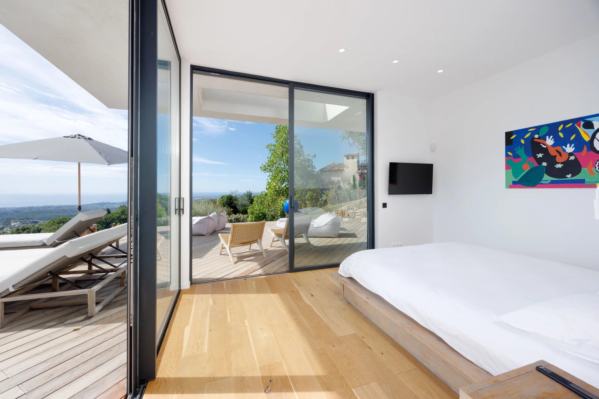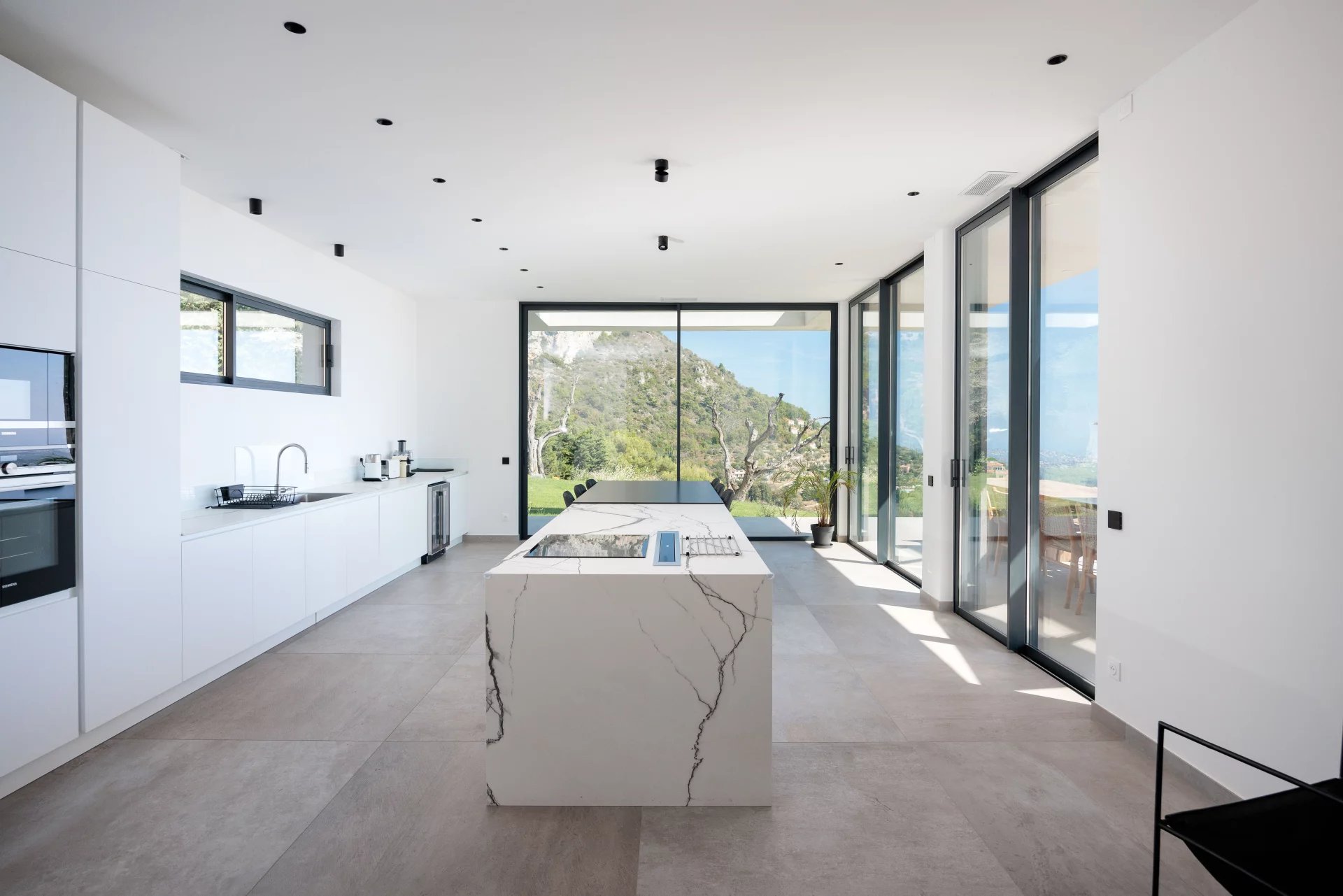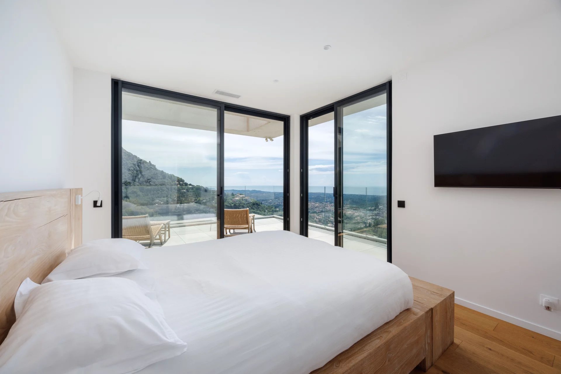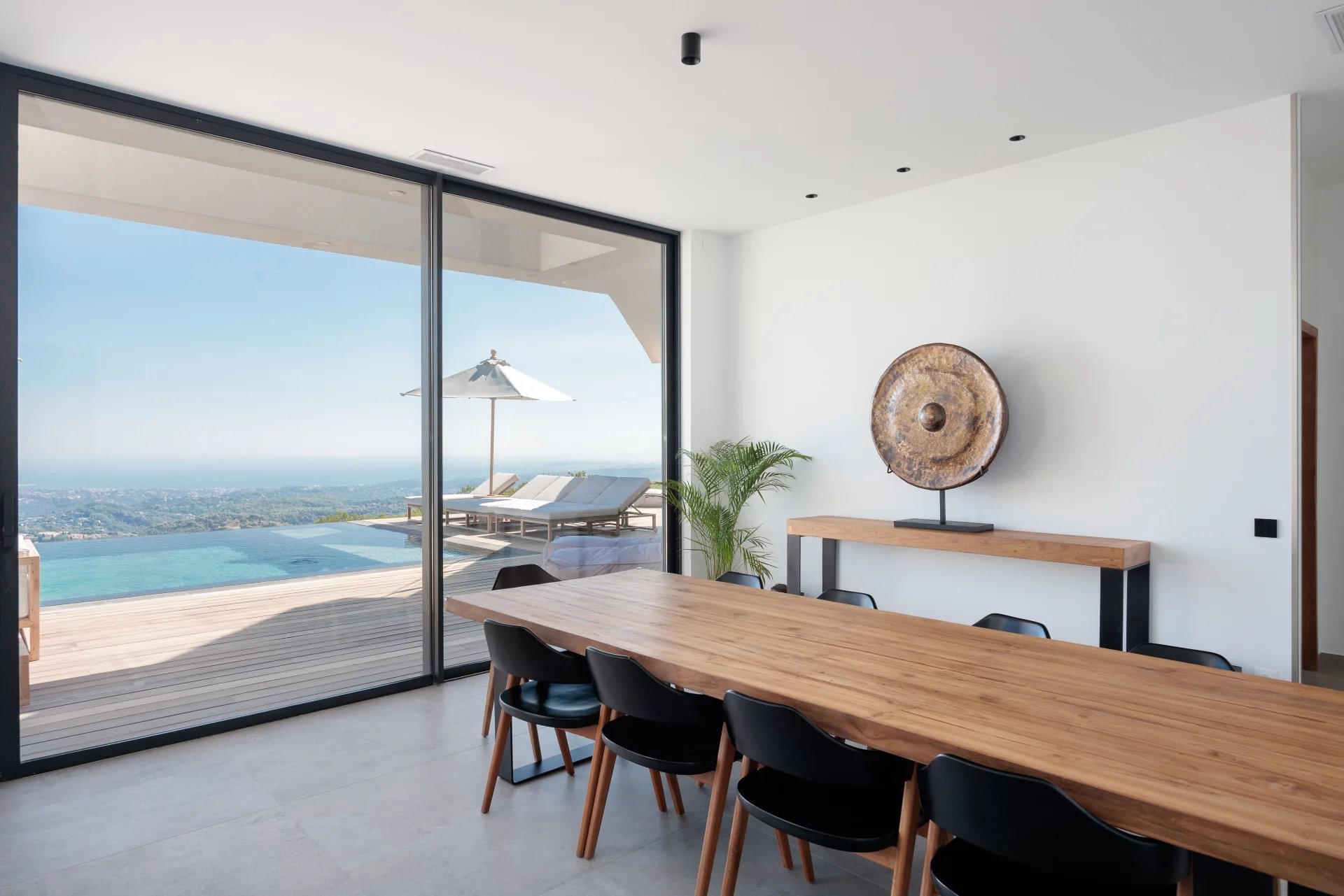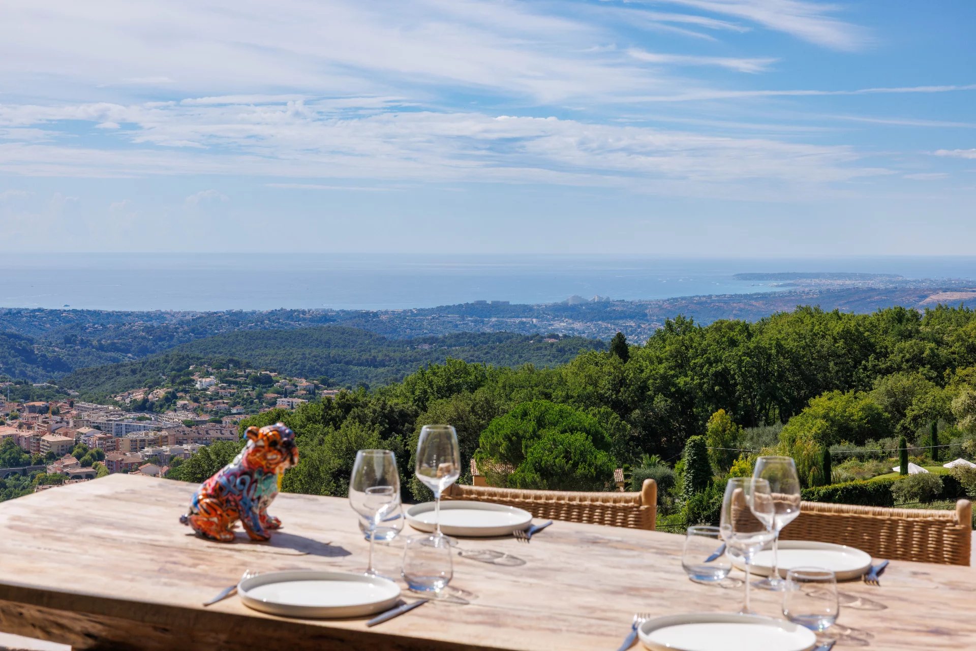 Cette superbe villa contemporaine de 355 m², récemment construite, est idéalement située sur les hauteurs de Vence, au cœur d’un terrain paysager de 4 000 m². Elle offre un cadre exceptionnel avec des vues de carte postale sur la mer — du Cap d’Antibes à la Baie des Anges et jusqu’au Cap Ferrat — ainsi que sur les montagnes environnantes.
