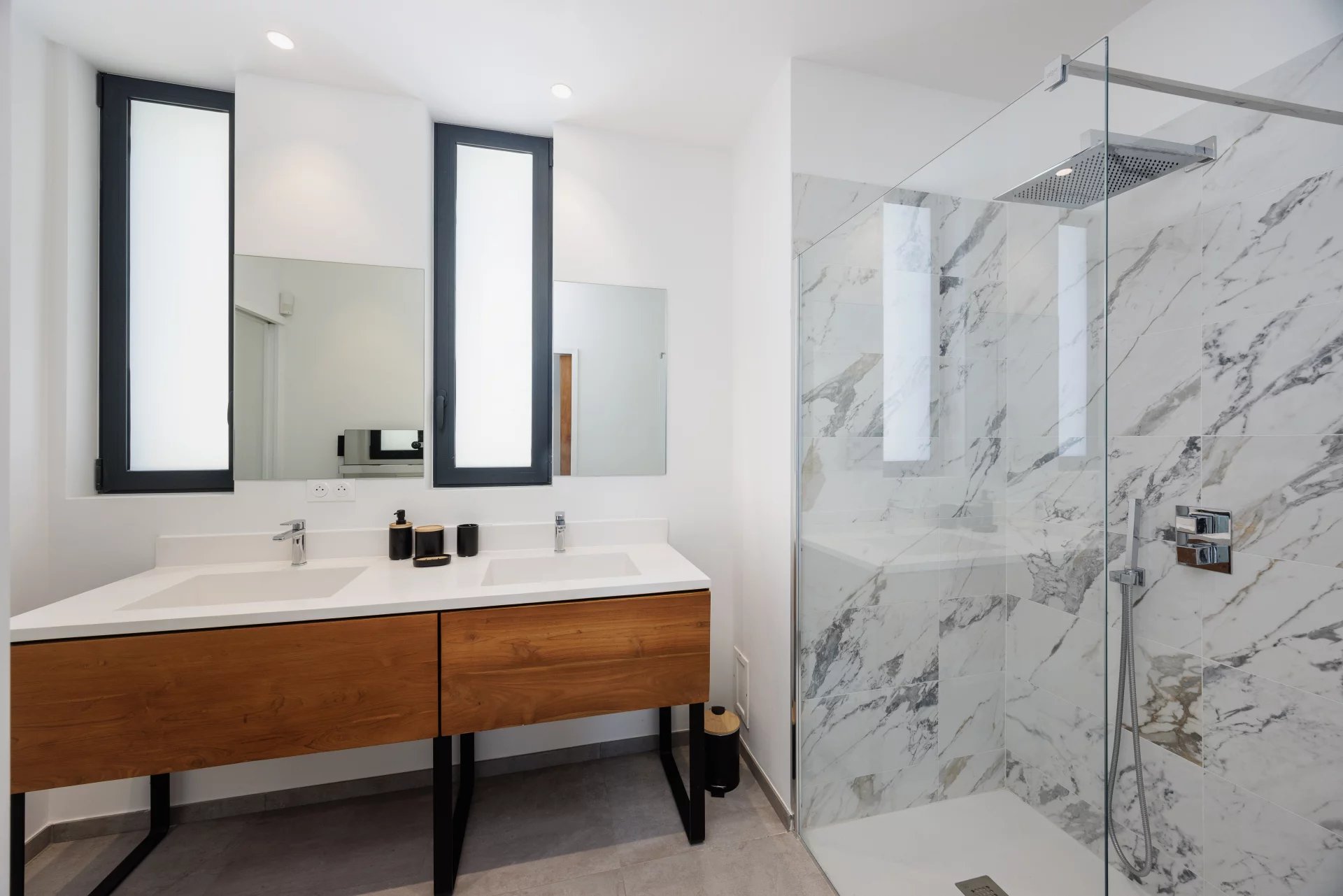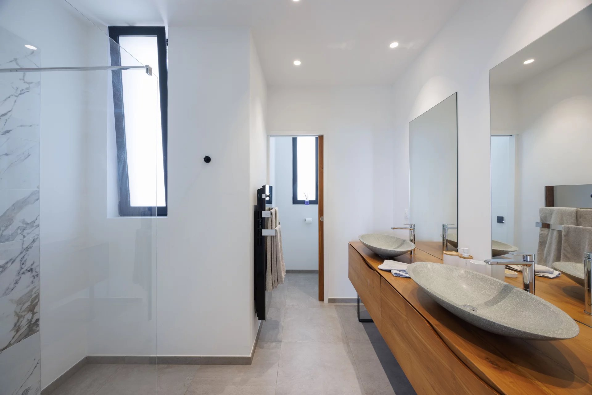 Au rez-de-chaussée, une première suite parentale avec dressing, salle de bains complète et un accès direct à la terrasse principale et à la piscine miroir à débordement, chauffée et au sel.